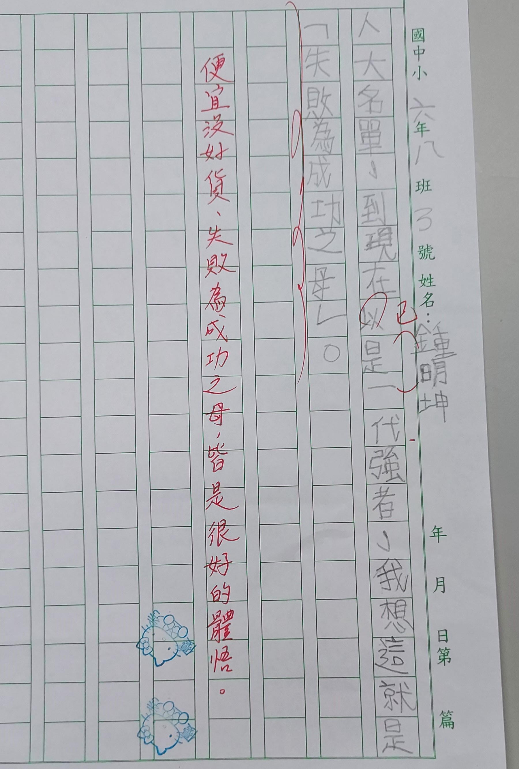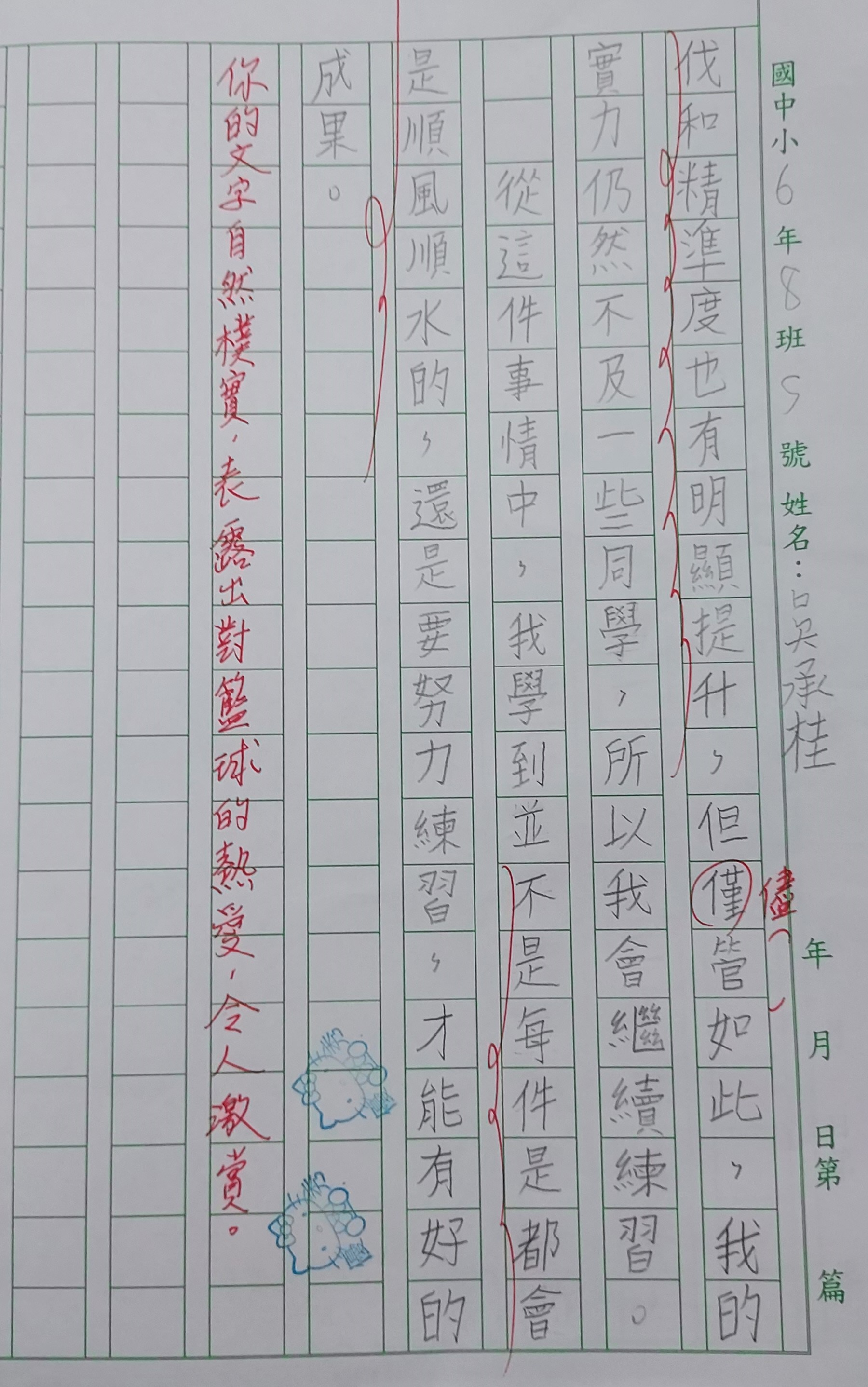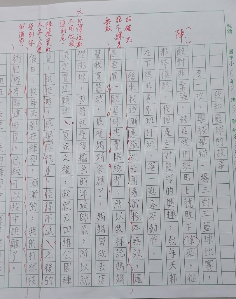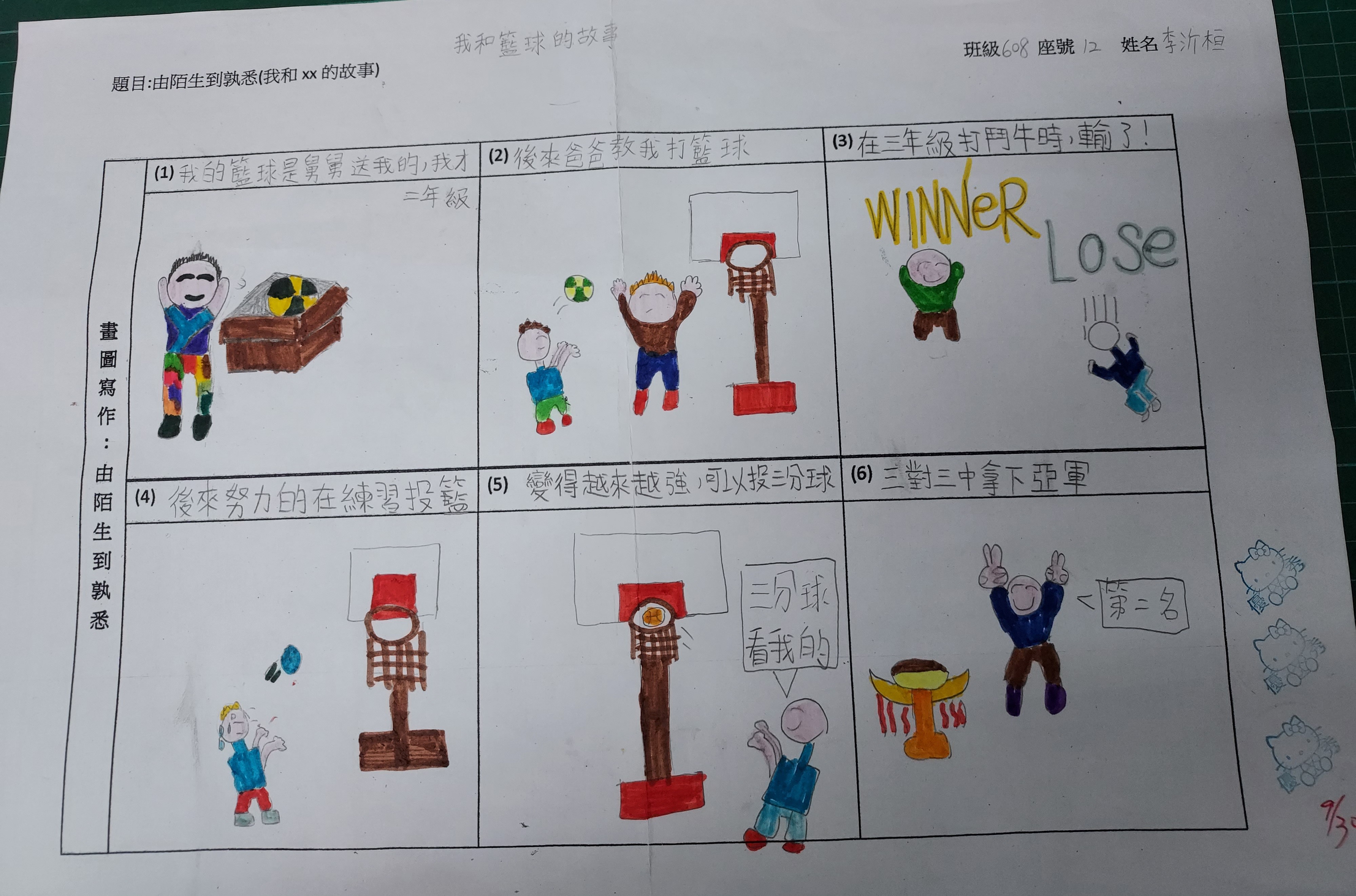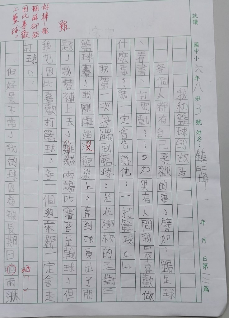 有位學生寫興趣是籃球:「但好景不常,我的球因為長期日曬雨淋而破了一個大洞,因為本土疫情爆發,爸媽怕我確診而暫時叫我不要打籃球。所以我沒有發現它早已經裂開。雖然我用瞬間膠搶救了,但仍然回天乏術。」讀完後我可以感覺到小朋友對他買的籃球很重視,不是用完即丟的習性。他接著寫:「後來再買一顆,買到盜版的,用了兩個月就壞了,還好林中(小飛俠)送我一顆籃球,不然我就暫時無球可打了。所以我學到了一個道理:便宜沒好貨。」一些小小的事件讓這位學生體驗到便宜沒好貨,很真實的感悟。