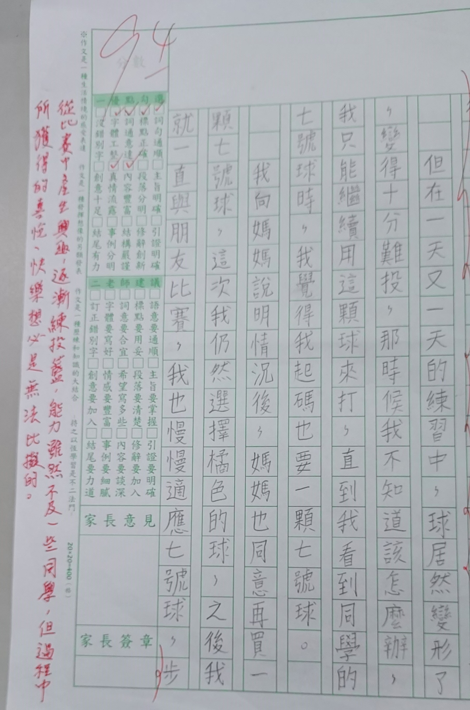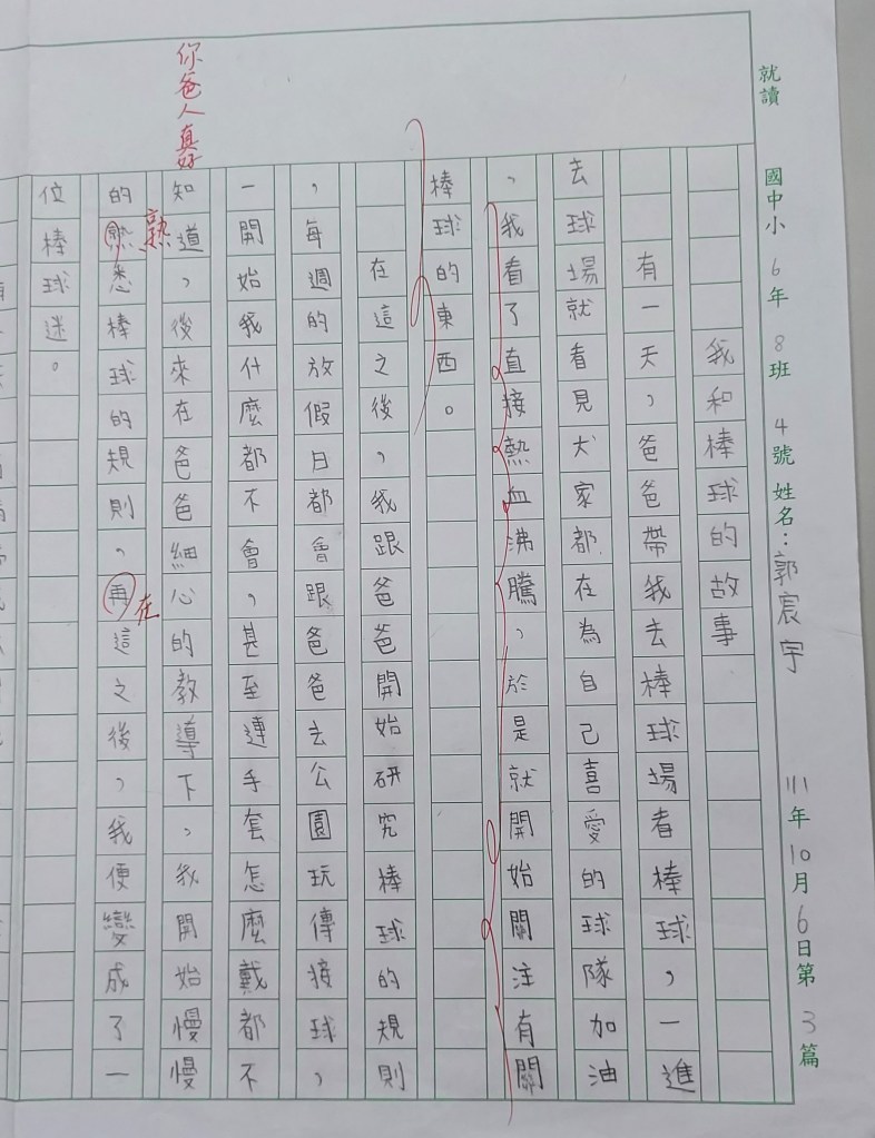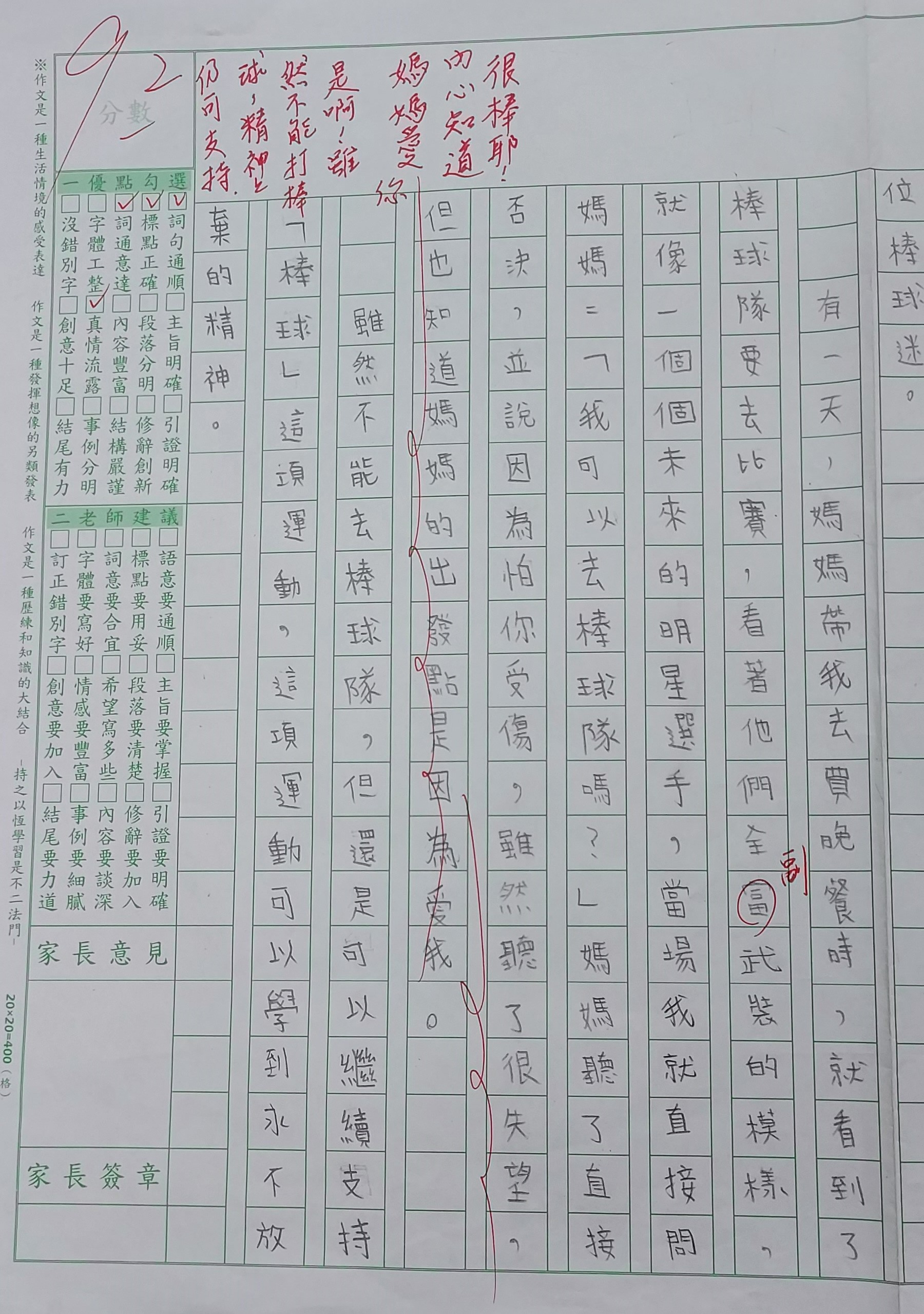 這位學生跟媽媽討論後,陳述了他不能繼續打棒球的原因,沒有刻意說他非常失望或表現出唉聲嘆氣,但可以隱約感受到他內心有小小的失落。這種淡淡的情感鋪陳,我認為蠻不錯的。