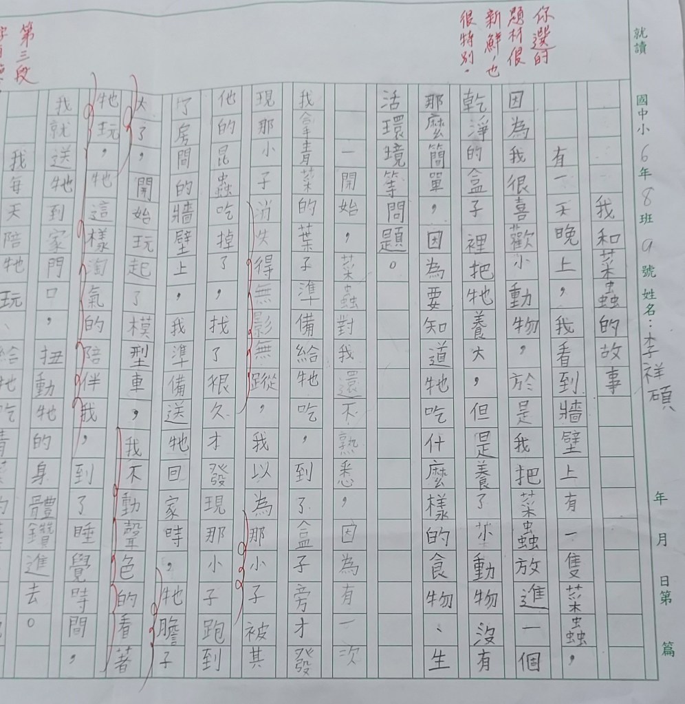 本班有些小朋友在寫最後的感悟時有卡住,例如某位學生是寫手機,和手機相處的過程中沒有發生高潮迭起的故事,也沒有沉迷於玩手機,因此最後一段的感悟就想不太出來。另一位學生也是寫手機,因為過程中手機有摔壞,然後爸爸不想再買給他,所以他體悟到:要好好愛惜物品,好好保管。後來我分析,同樣選手機,若選的題材跟他自身的關係不密切,或是他在手機的使用上只是用來查一下資料或上上Youtube看個短片,就著情感的依賴和依附上來講不夠多,可能就比較難想到感悟了。所以下次若有機會再指導這個題目時,一開始的選題材上,我會特別說明使用這個物品你會感到很喜歡或很投入的,不是一般的喜歡而已;這項興趣在生活中陪伴已經很久,或是常常想到會充滿熱情,吸引你投入很多精力的;或是這位朋友是你很難割捨放下的,朋友在學校確實幫助你很多,這樣小朋友在選擇時也許就能篩選出比較適切和好發揮的題材了。