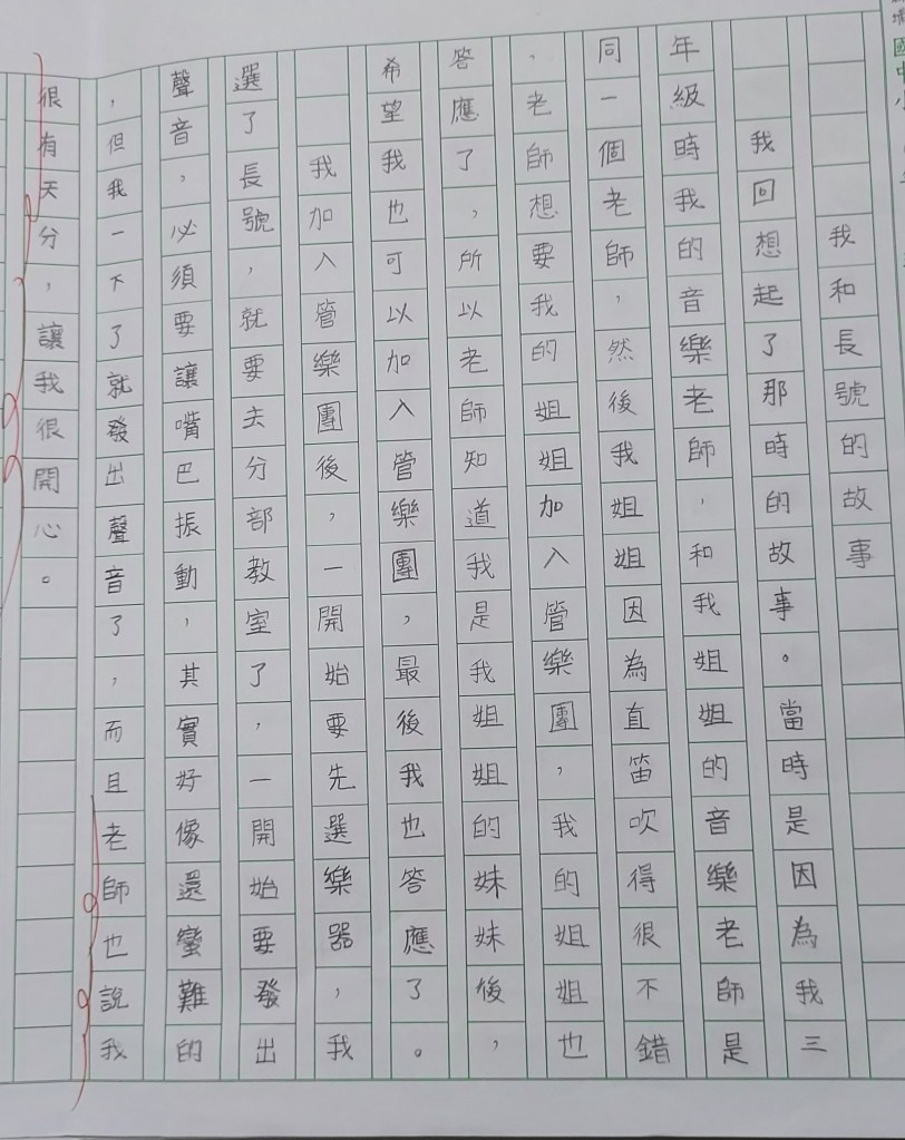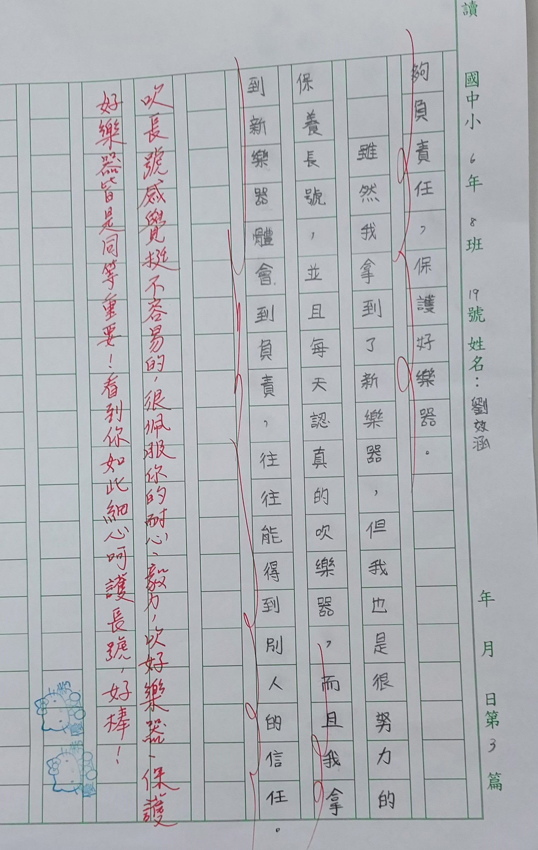 至於最後一段的體悟,如同〈珍珠鳥〉所說「信賴,往往能創造出美好境界。」簡明扼要,不拖泥帶水。這次指導時有提醒小朋友簡單寫即可,例如有學生寫學籃球:「從這個事件,我學到了不是每件事都會是順風順水的,還是要努力練習,才能有好成果。」另位學生寫:「而且我拿到新樂器體會到負責,往往能得到別人的信任。」