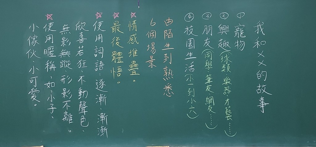 第四課〈珍珠鳥〉的寫作以〈從陌生到熟悉〉來命題,題目訂為:我和xx的故事,希冀小朋友透過寫作幫助自我省思,繼而有所體會和成長。引導步驟如板書:
