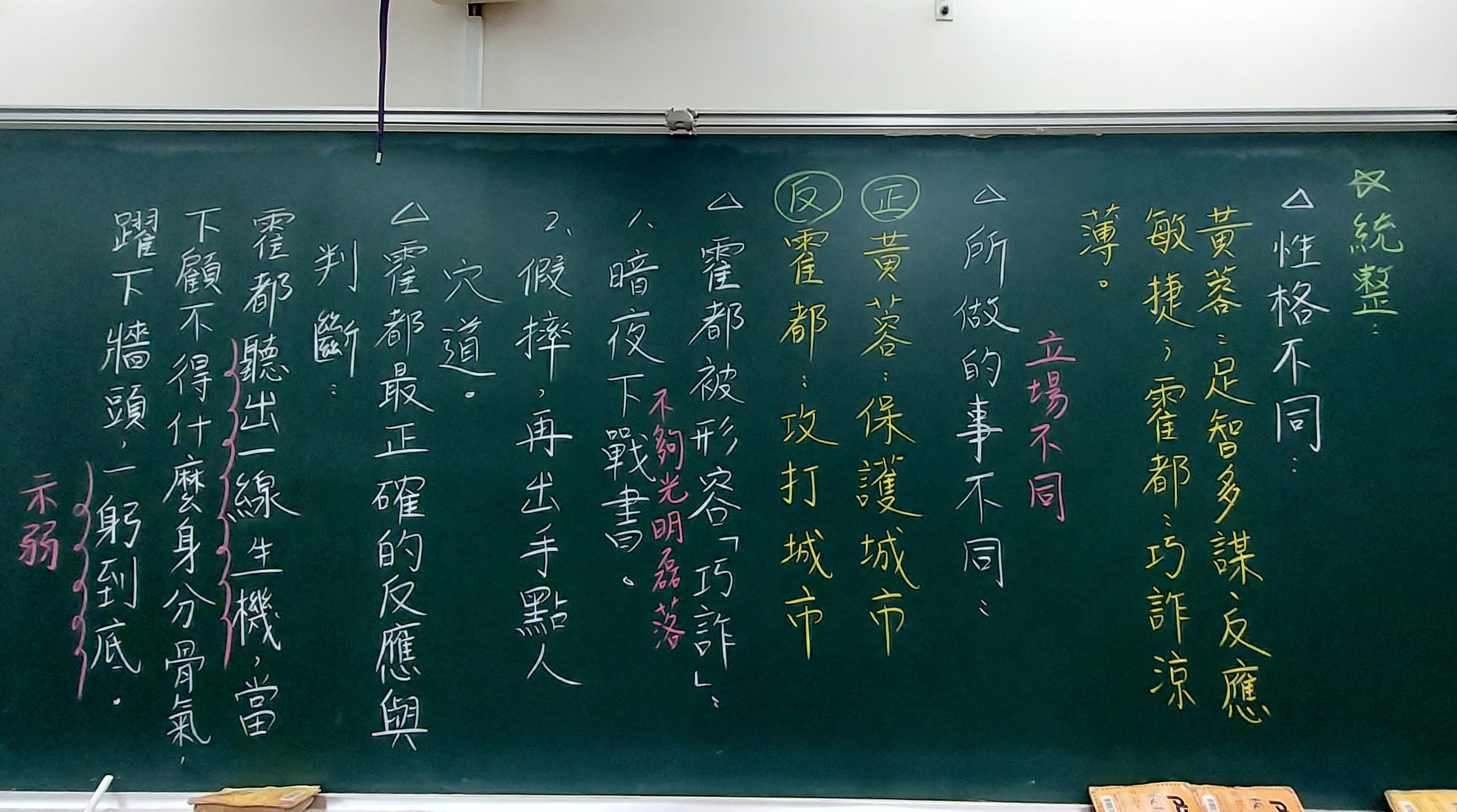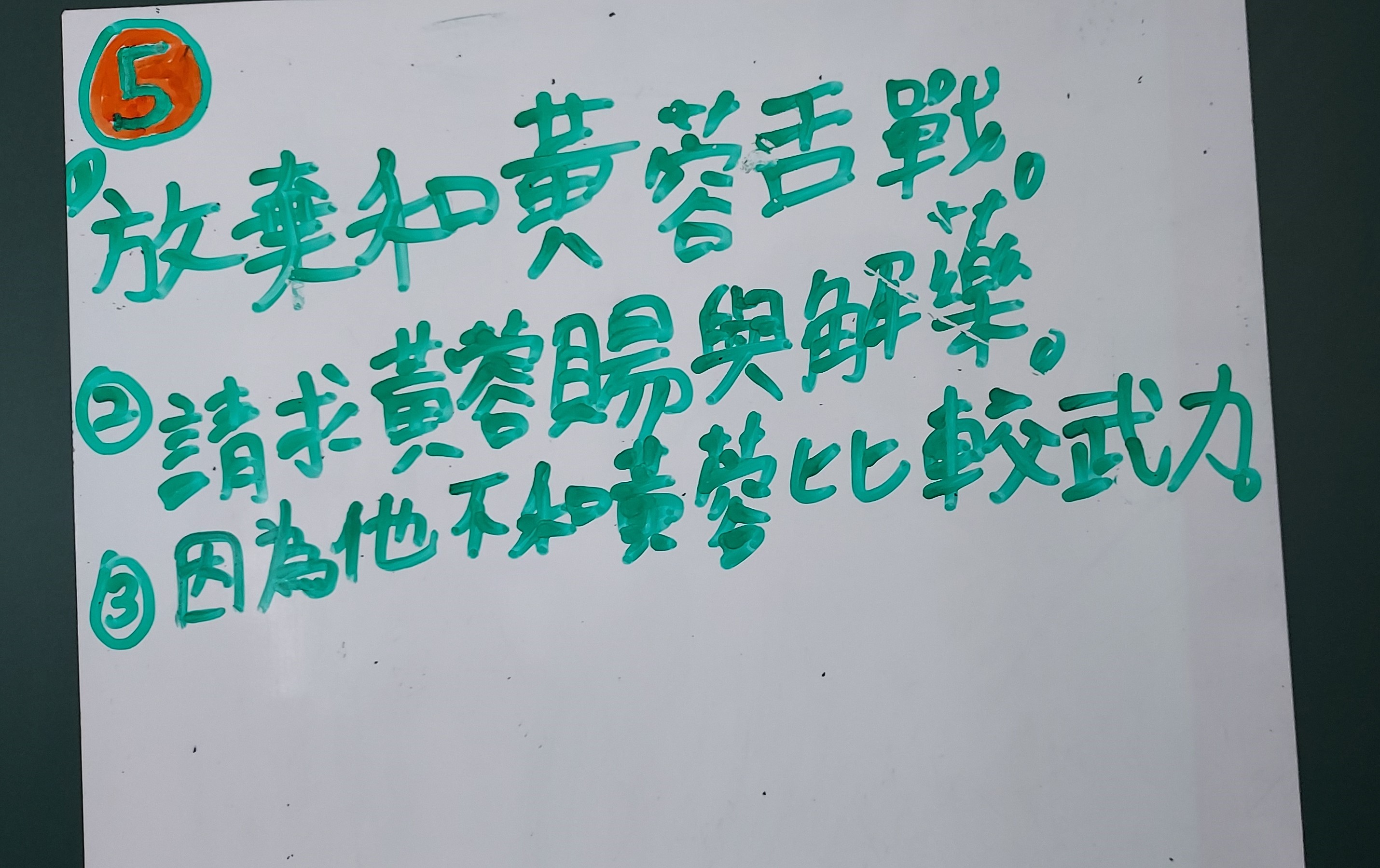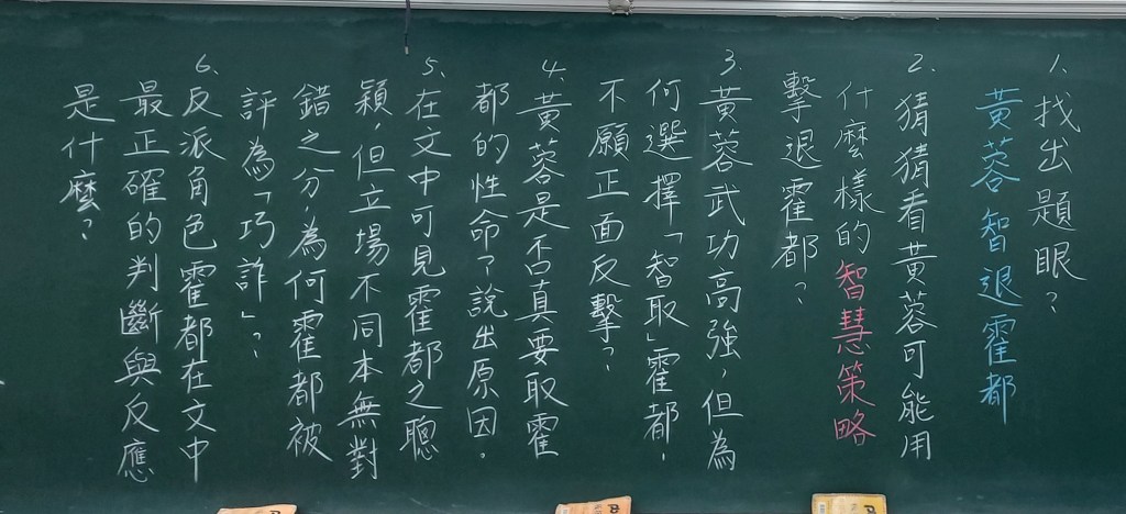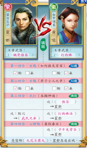 第二題問黃蓉使用的智慧策略,學生口頭回答的答案有:用嘴巴講贏(辯論)、利誘、下毒、反間計、哀兵政策、先示弱再循機會逃脫、假裝講和然後趁機反擊等,一步步帶出國語習作所列的四回合大戰:舌戰、舌戰、武打、心理戰。很顯然,一開始雙方並沒有馬上武打,而是等到第三回合才各自施展出武功來,最後黃蓉採用「心理戰術」,以「子午見骨茶」和「九花玉露丸」兩招嚇退霍都,由此可顯示出黃蓉的機智,不愧被稱為「女中諸葛」。