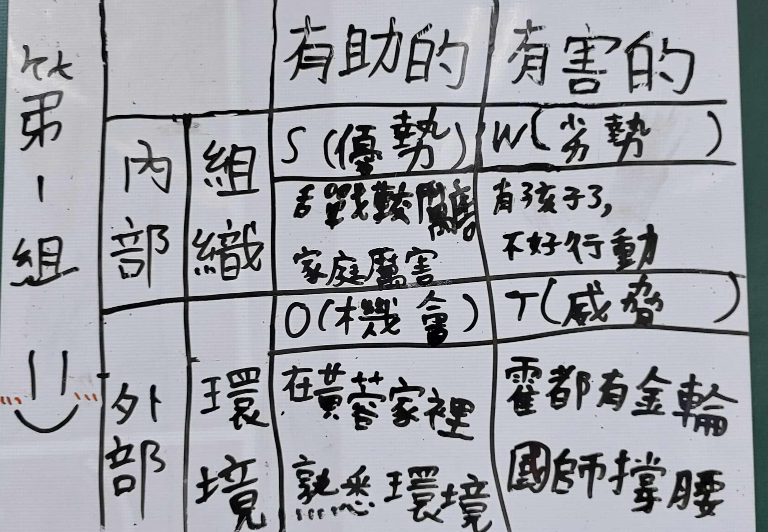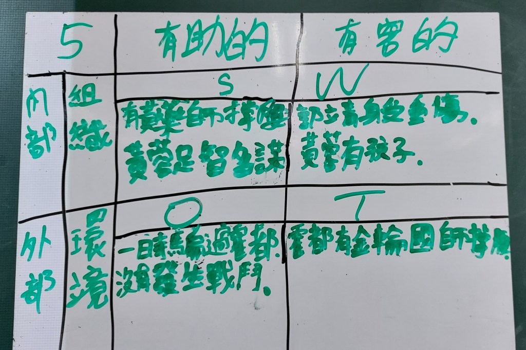 第一次帶孩子使用SWOT表來分析局勢,算是蠻新鮮的嘗試,內部組織優勢如黃蓉的家庭厲害,我細問之下,才知這一組指的是黃藥師精通藥理,黃蓉有家傳之學;外部環境威脅像是霍都有金輪法王撐腰,霍都來勢洶洶,蒙古軍隊很強等。至於「敵暗我明」起初是黃蓉的不利因素,學生沒有找到,老師可額外補充,並引導學生「熄滅燭火」的簡單動作,是黃蓉從劣勢反轉為優勢的重要關鍵。