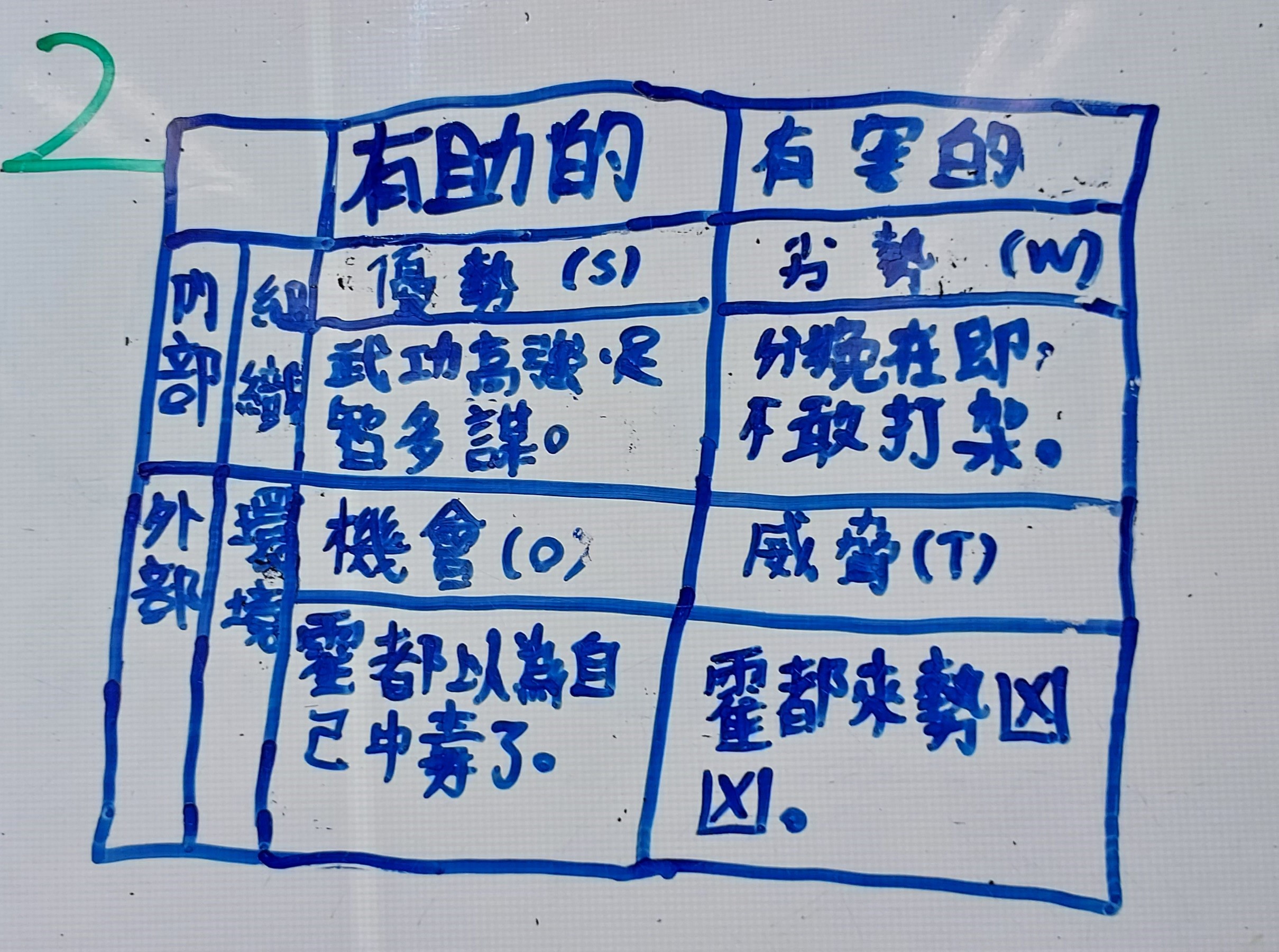 此次提問教學的重點,我放在黃蓉為何(Why)和如何(How)以機智戰勝霍都,並訓練孩子用SWOT表來分析局勢(參閱賴建光老師的部落格),最後歸納出黃蓉和霍都各自的性格和立場。