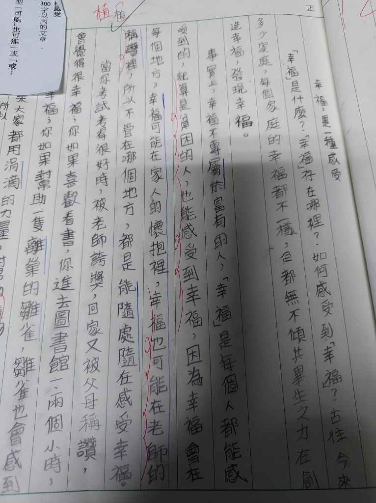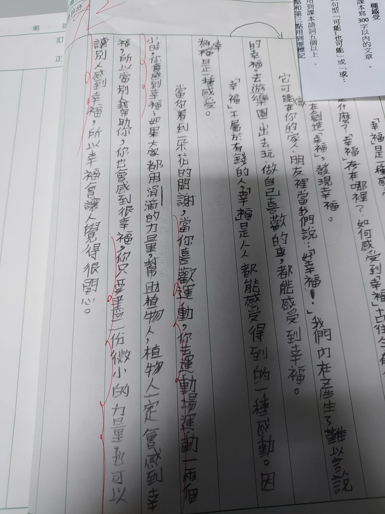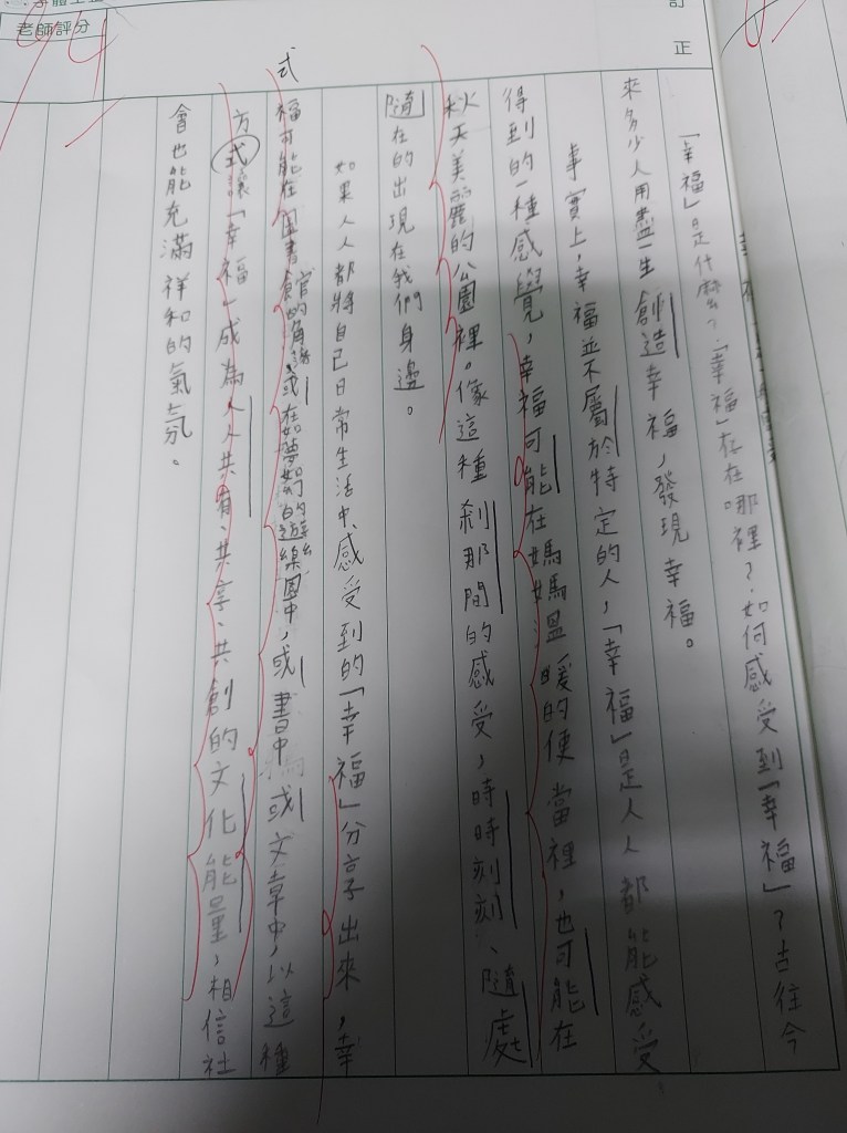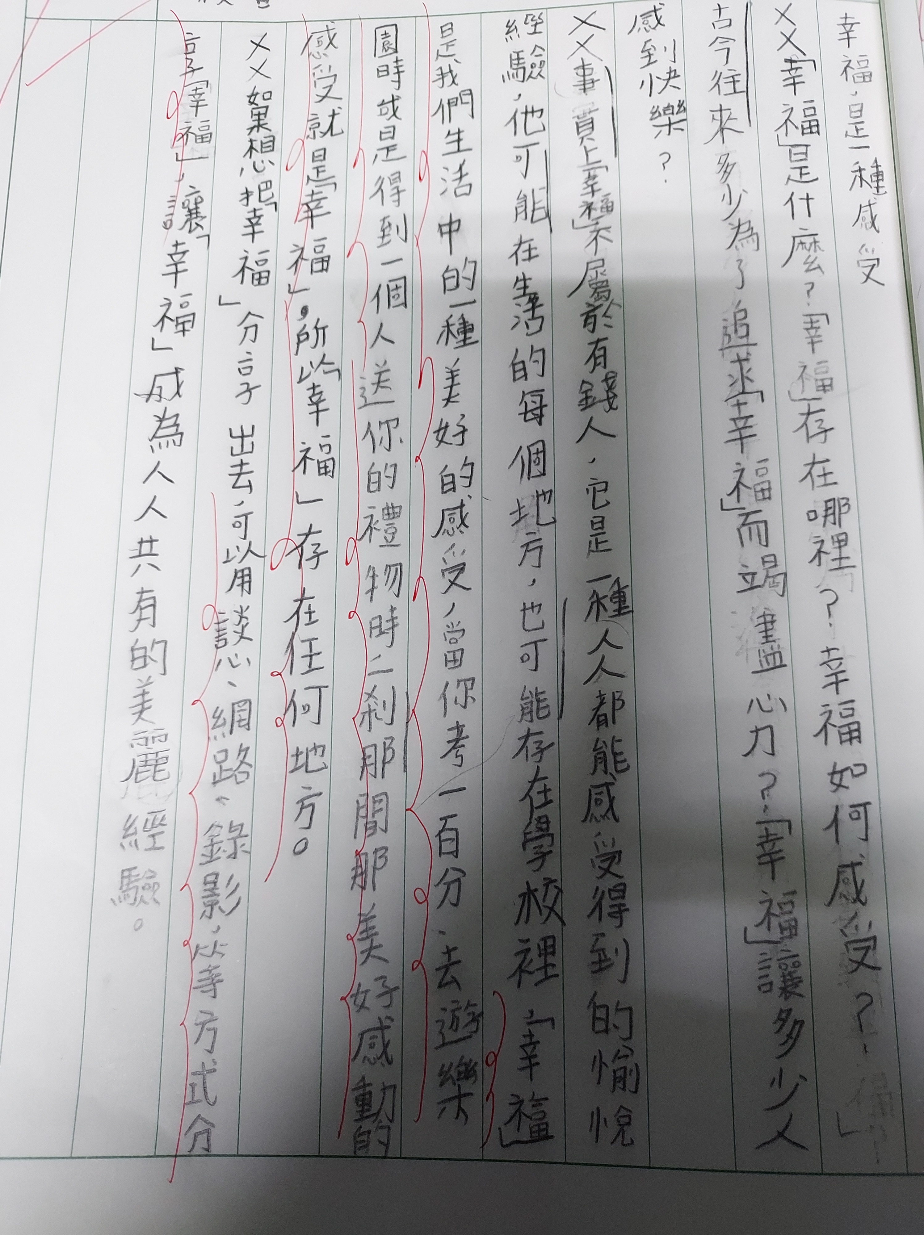 短文寫作,大約300字左右,分為三段,題目訂為:「幸福,是一種感受」。