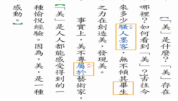 課文開頭用強而有力的問句–美是什麼?美存在哪裡?如何看到美?連續三個問句來引起注意,第二段則為美下了一個定義:美是人人都能感受得到的一種愉悅經驗。此種手法為設問法中的提問(南一六上語文天地一)。除了三個連續問句很適合進行仿寫,課文中亦有不錯的句型可搭配運用,如下: