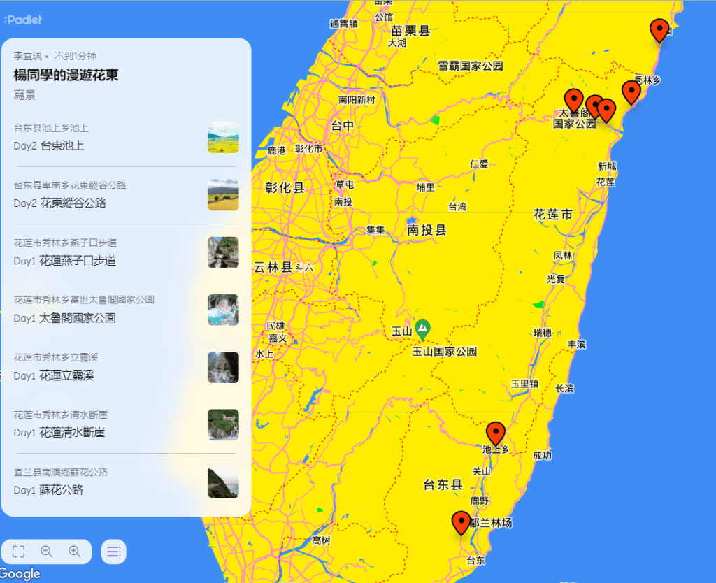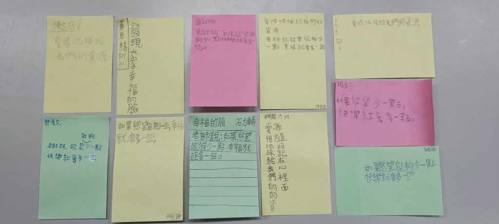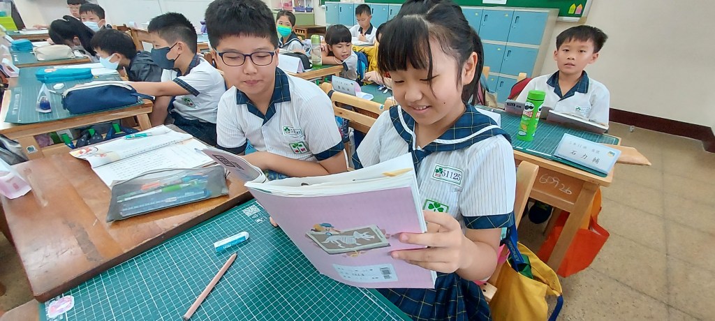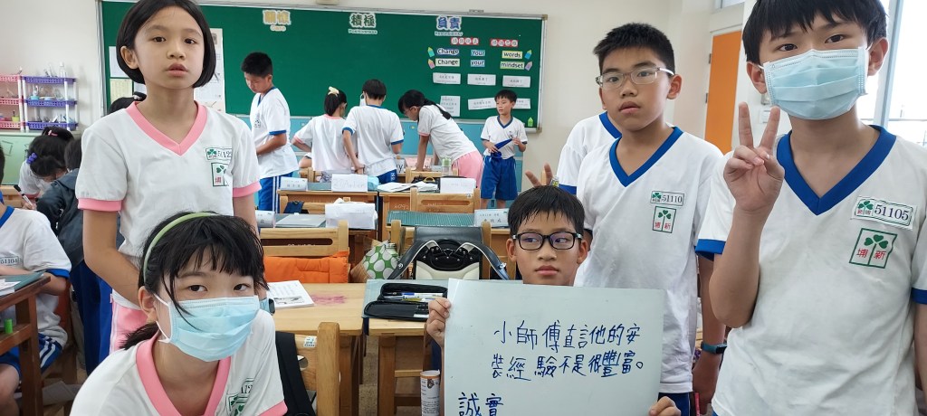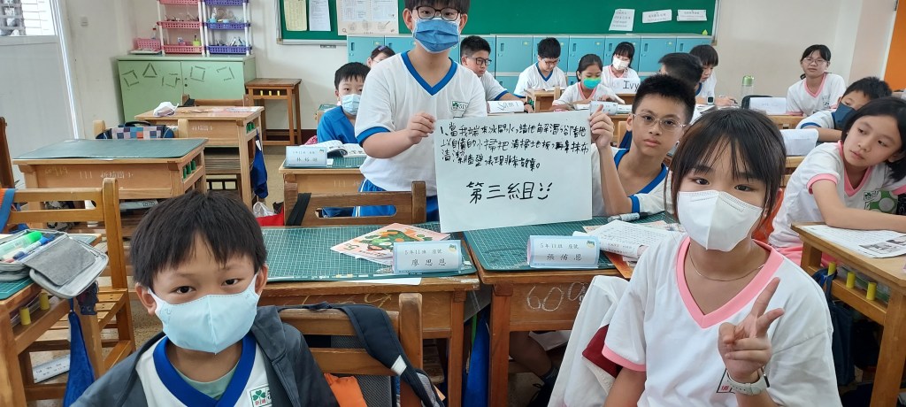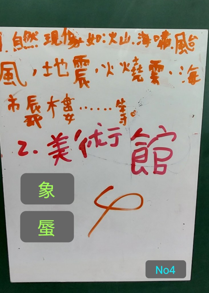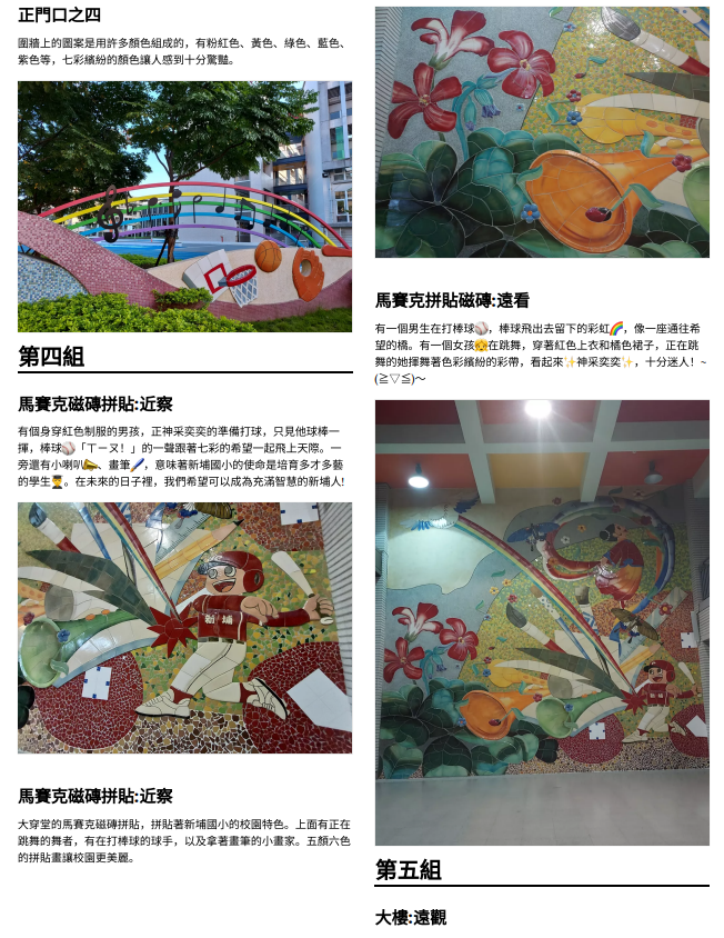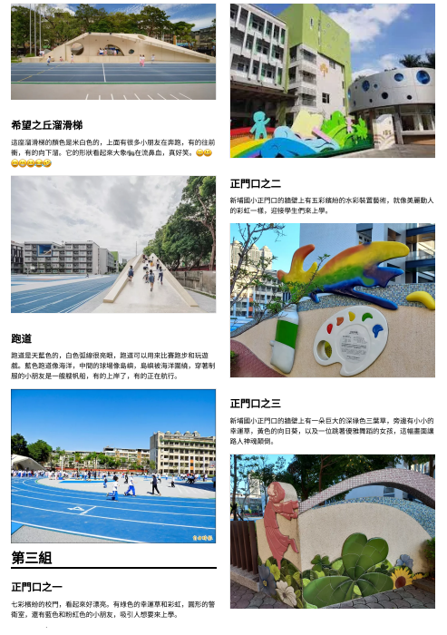 在進行寫作課前,我問孩子們學校有什麼美的地方呢?蠻多人說希望書屋,這是新埔國小新蓋的圖書館,的確優美,但除了圖書館以外,孩子們說不太出具體的景物或藝術造景,操場、草地、大樓……都很籠統,於是我便把上一屆我拍過的藝術造景照片給孩子們觀賞,用padlet來進行教學。以下是分組合作的成果: