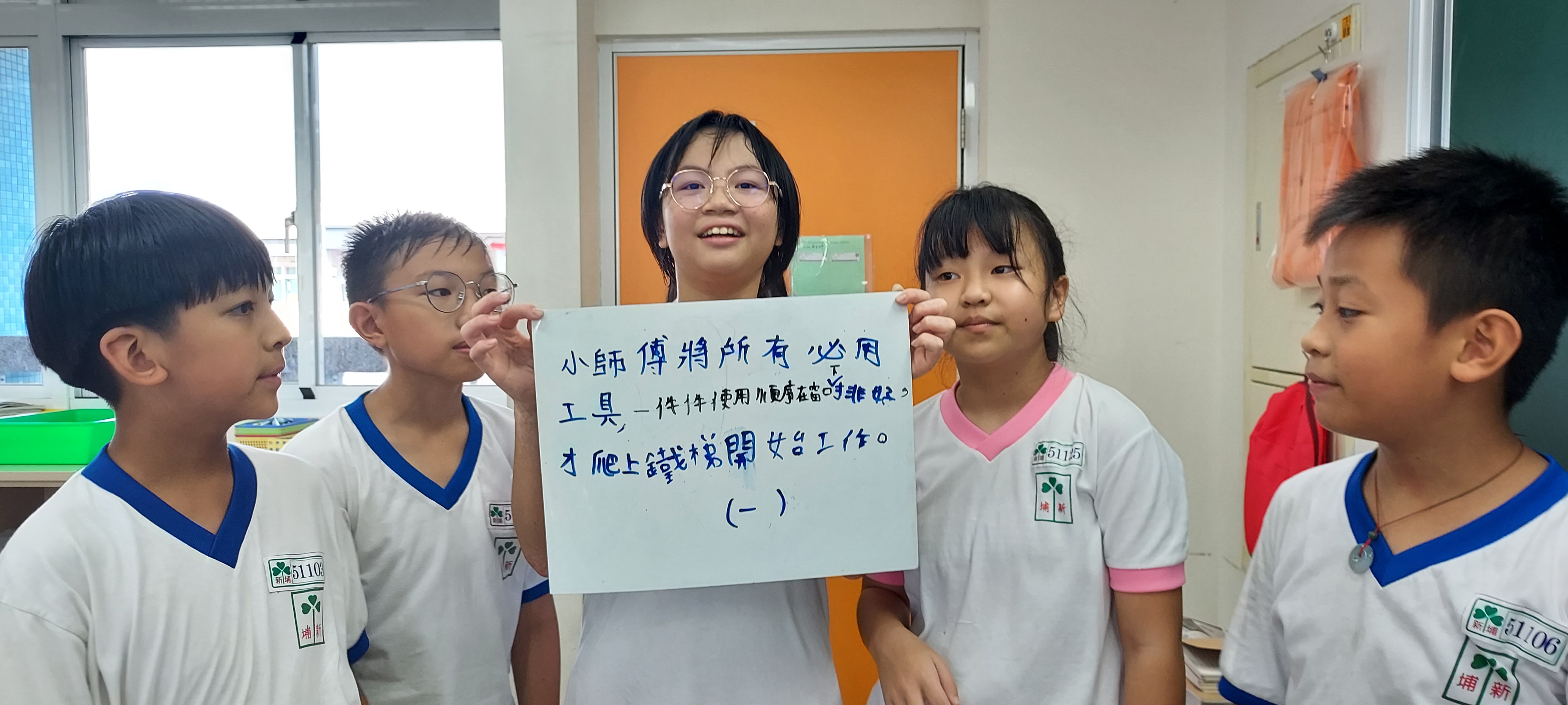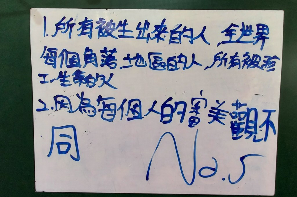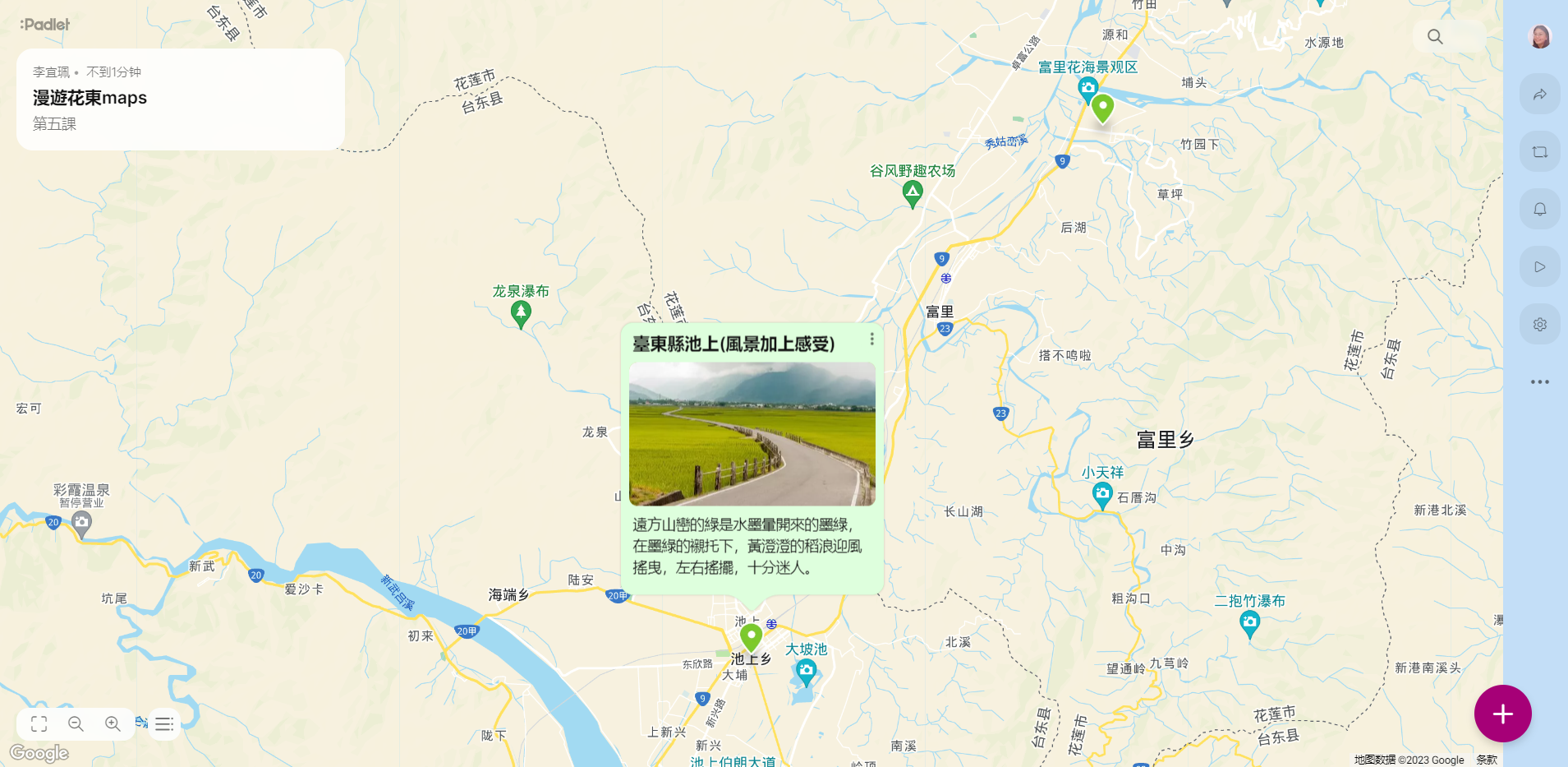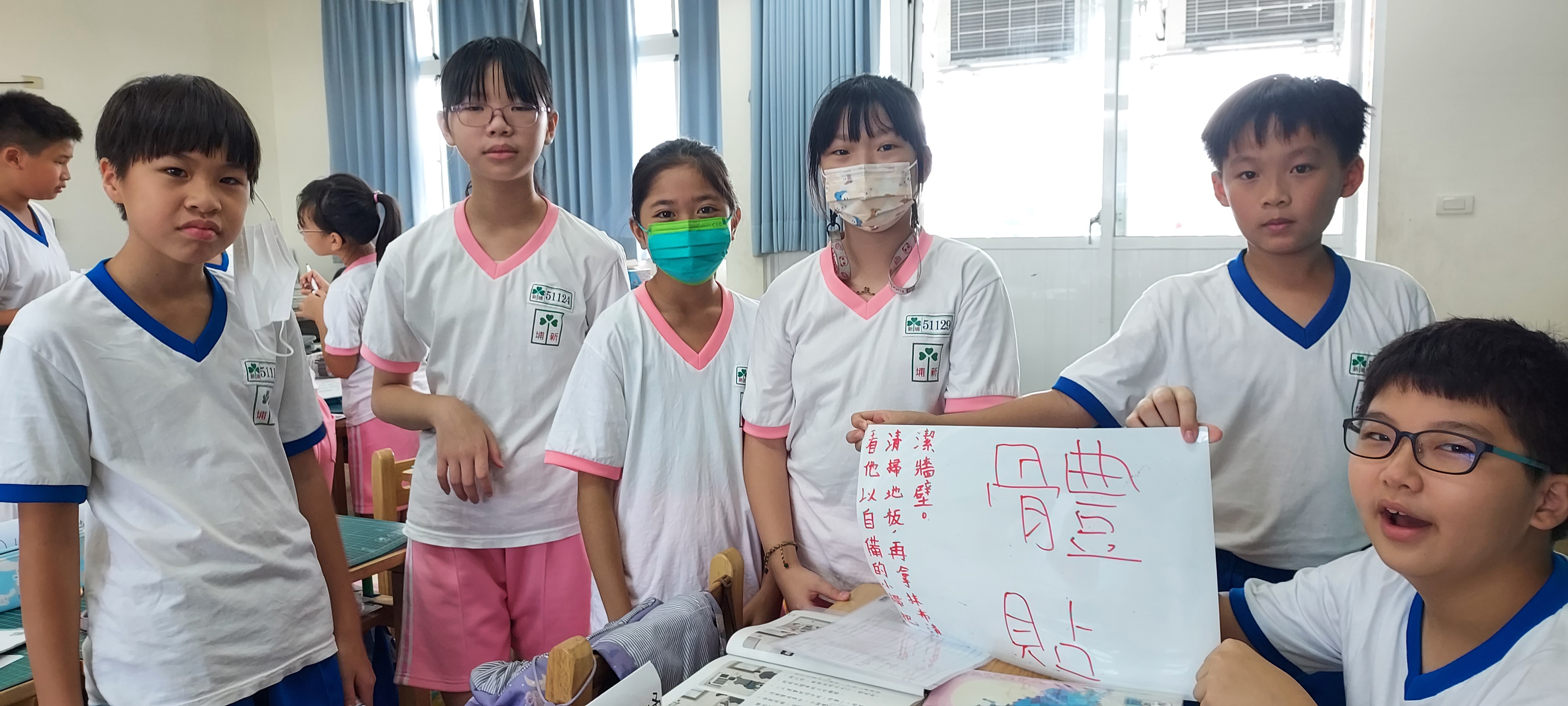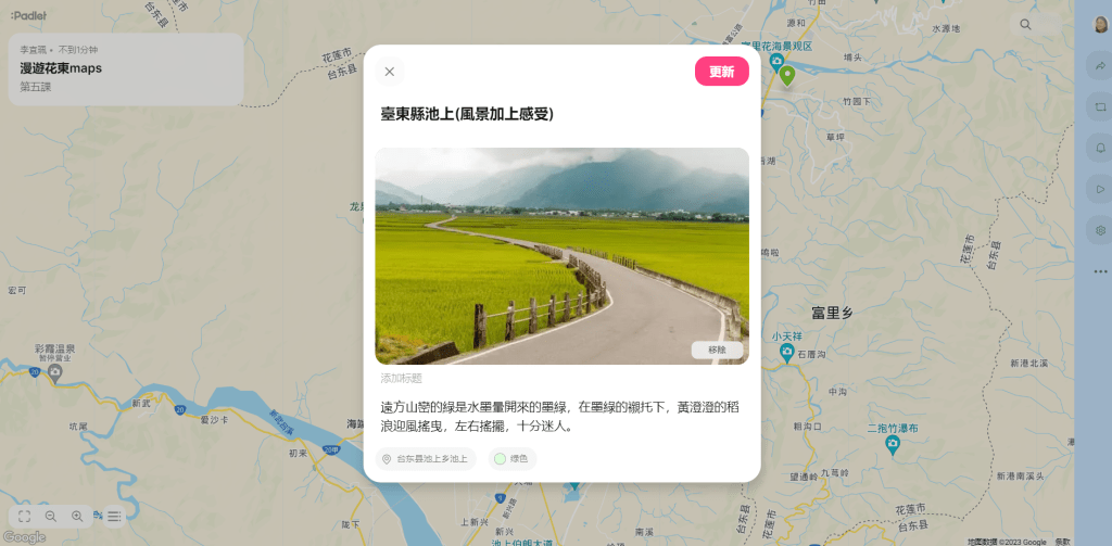 在進行寫作課前,我問孩子們學校有什麼美的地方呢?蠻多人說希望書屋,這是新埔國小新蓋的圖書館,的確優美,但除了圖書館以外,孩子們說不太出具體的景物或藝術造景,操場、草地、大樓……都很籠統,於是我便把上一屆我拍過的藝術造景照片給孩子們觀賞,用padlet來進行教學。以下是分組合作的成果: