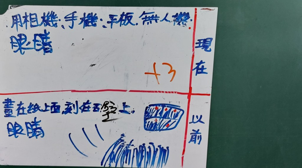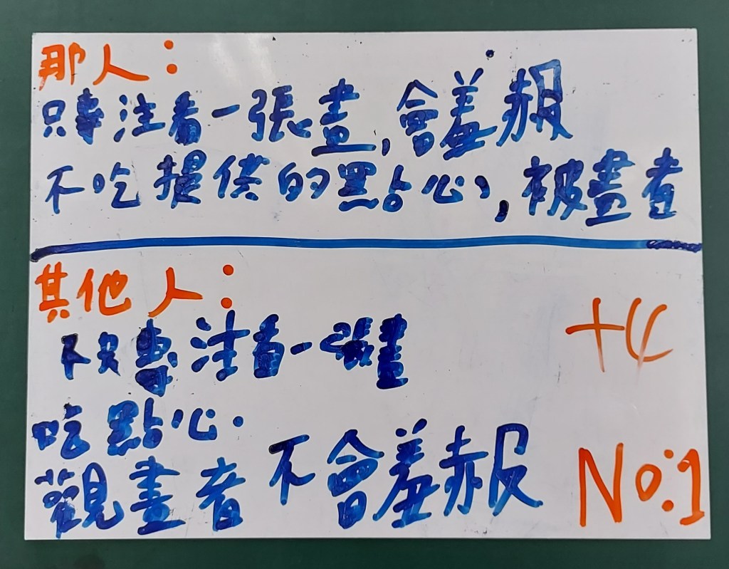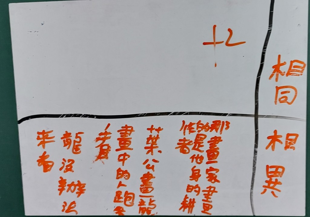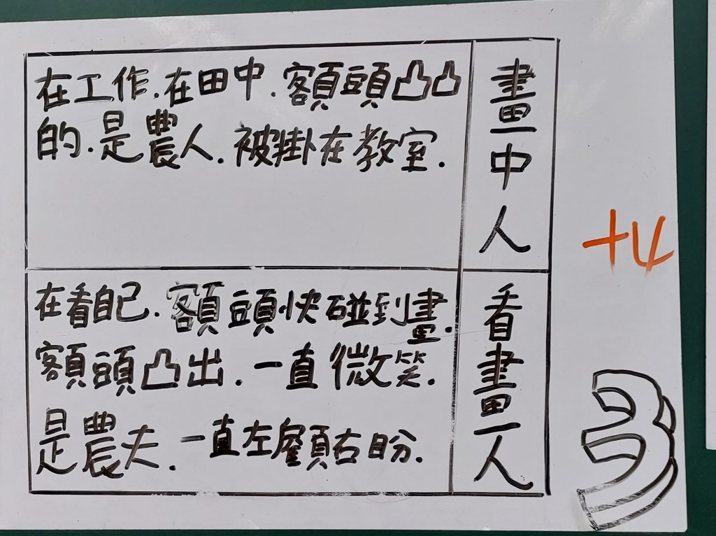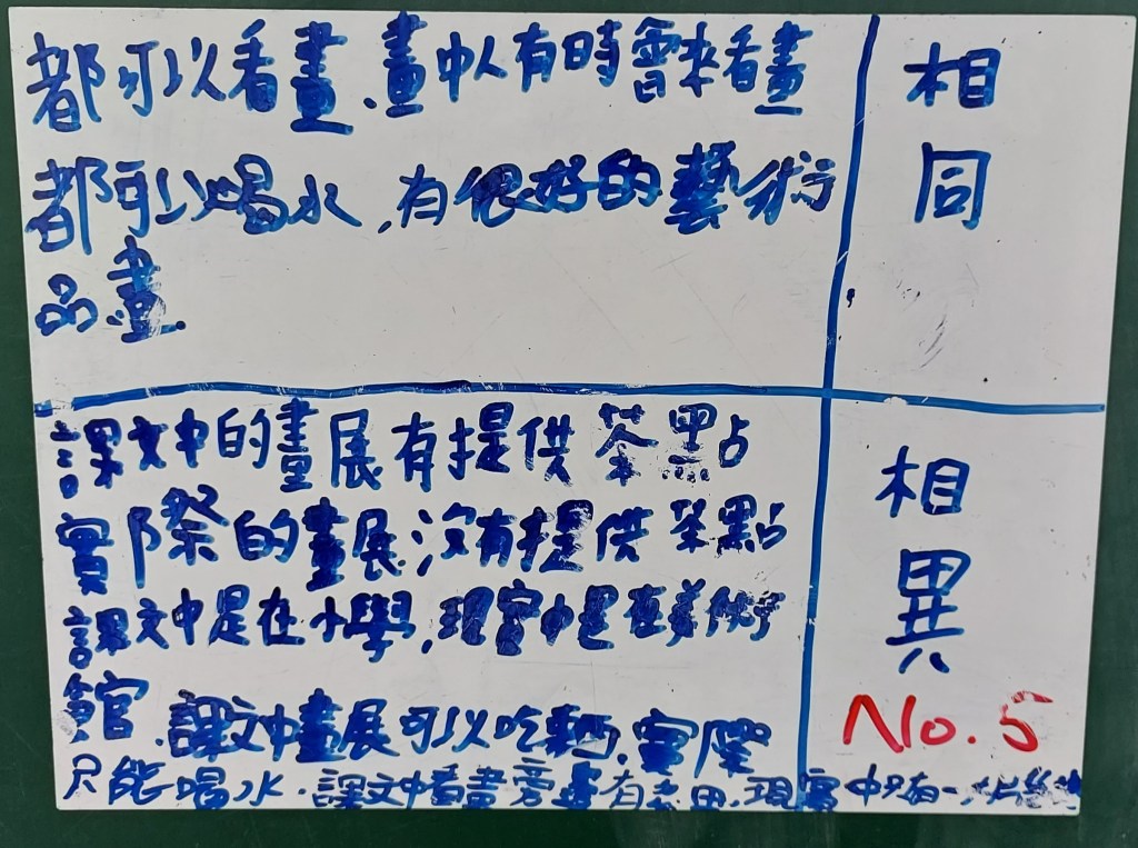 我蠻想帶學生實際去校園巡禮,畢竟要產出寫景的短文,走一趟是比較好,但聽同事說有帶孩子們去校園走走,回來書寫的狀況不好,寫景很難,寫不出什麼東西。我想一方面是這麼多人一起出去逛,老師若不像導覽員直接點出要觀察的重點,那麼孩子們也只是走馬看花,看了很多東西也留不下什麼印象。若是老師只帶一、二組出去校園巡禮,效果應該會很好。另一方面,看景物、看東西要有感,如果現在叫孩子們看零食種類、遊戲種類,眼睛馬上睜得很大。所以,我想倒不如就在教室裡看平板觀察景物,安靜看,反覆看,各組有問題老師巡視起來也很方便。