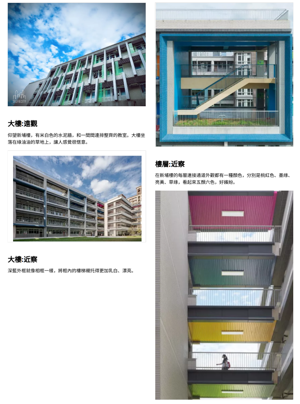 仰望新埔樓,有米白色的水泥牆,和一間間連排整齊的教室。大樓座落在綠油油的草地上,讓人感覺很愜意。