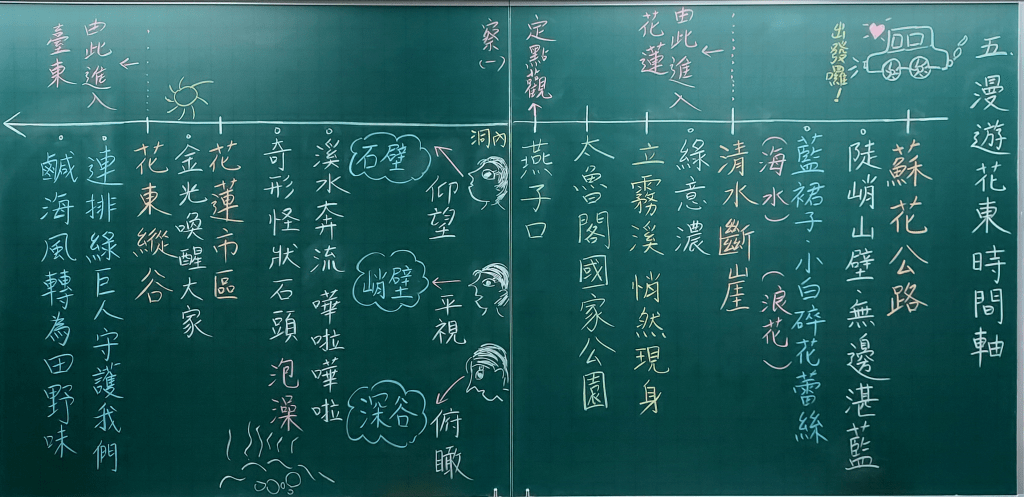 南一五上〈語文天地二〉提到觀察與描寫,〈漫遊花東〉課文裡使用了「定點觀察法」來描寫景物,學到這個寫作技巧不能只是知道,還需要透過練習,才能應用得出來;讀了要輸出,才能內化成自己的東西。